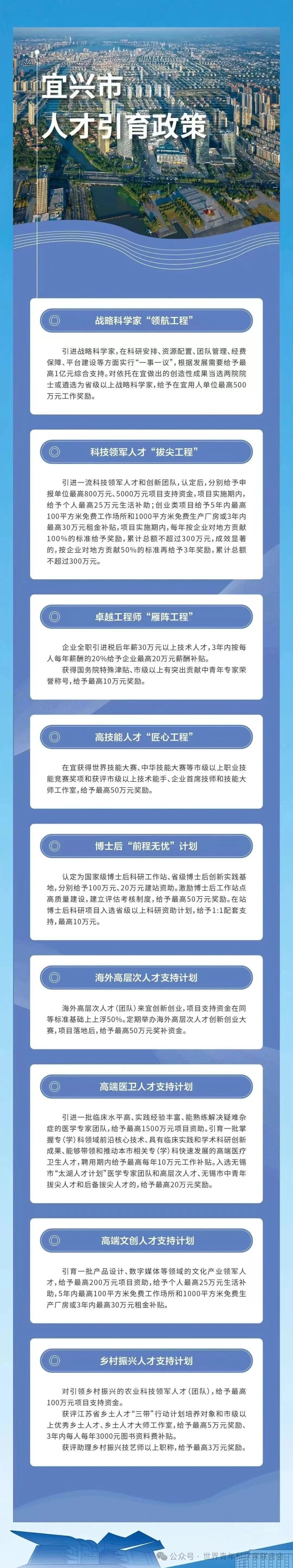 信息链接:宜兴市近年来不断优化人才发展环境,推出“宜兴市人才引育政策”,对战略科学家、科技领军人才、创新创业团队等重点群体提供全方位支持,助力各类人才精准对接,共享宜兴高质量发展机遇。